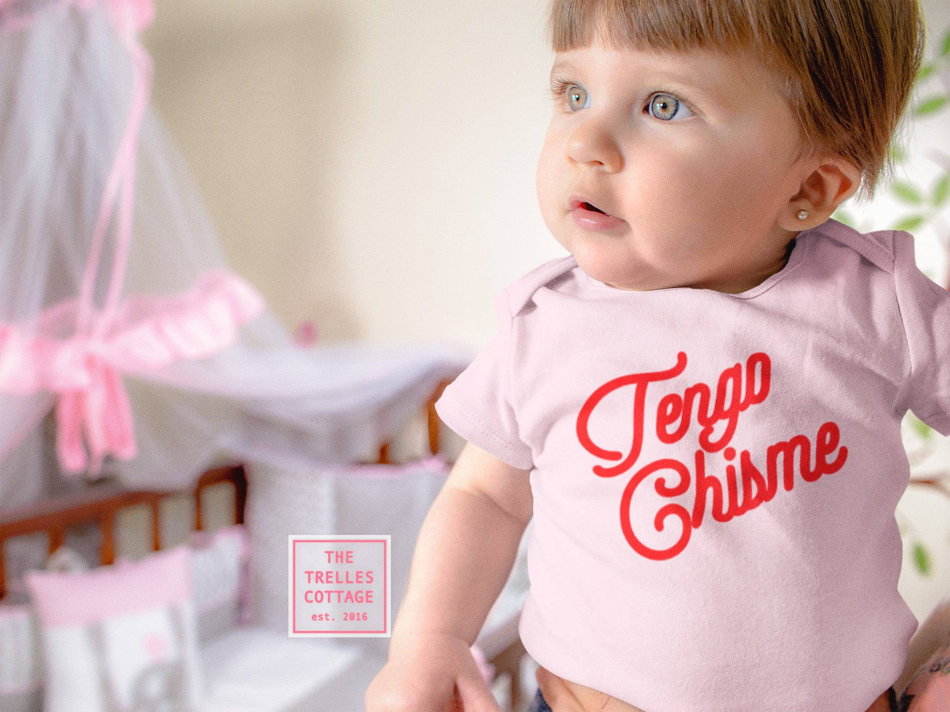 Even little ones have chisme! Tengo Chisme, literal translation "I have gossip". This comfortable bodysuit will be a great addition to any baby’s wardrobe, and lap shoulders will make for easier changing.