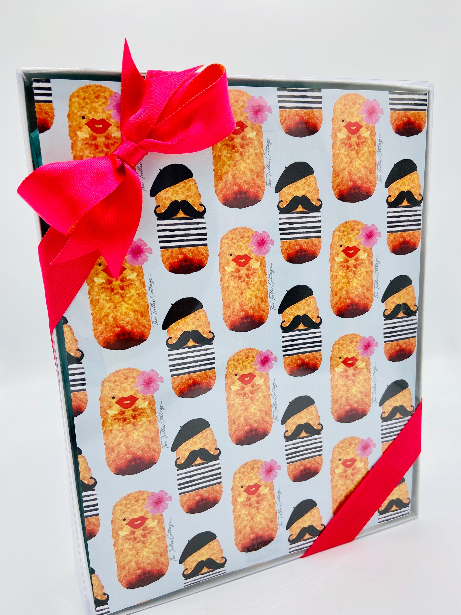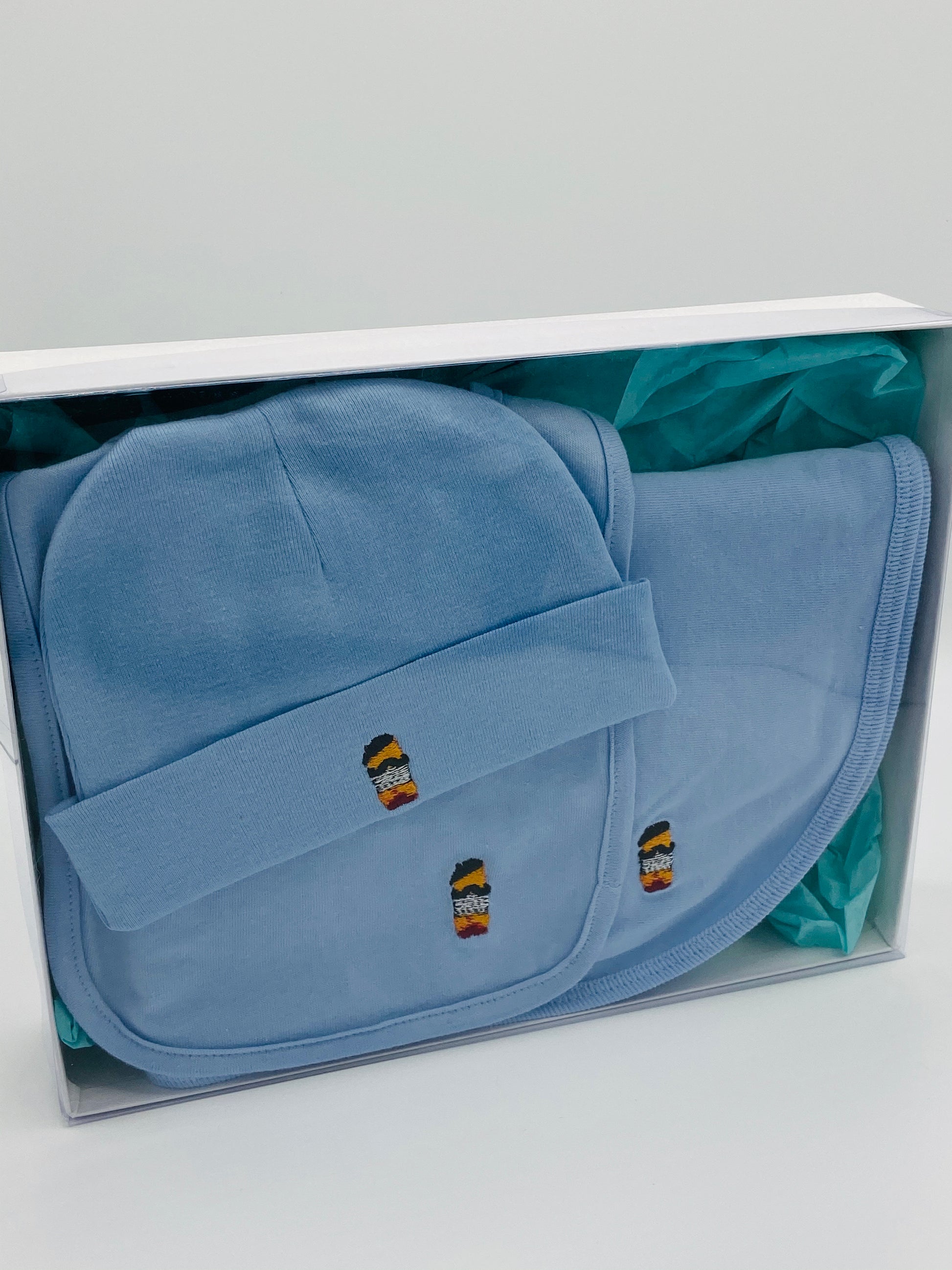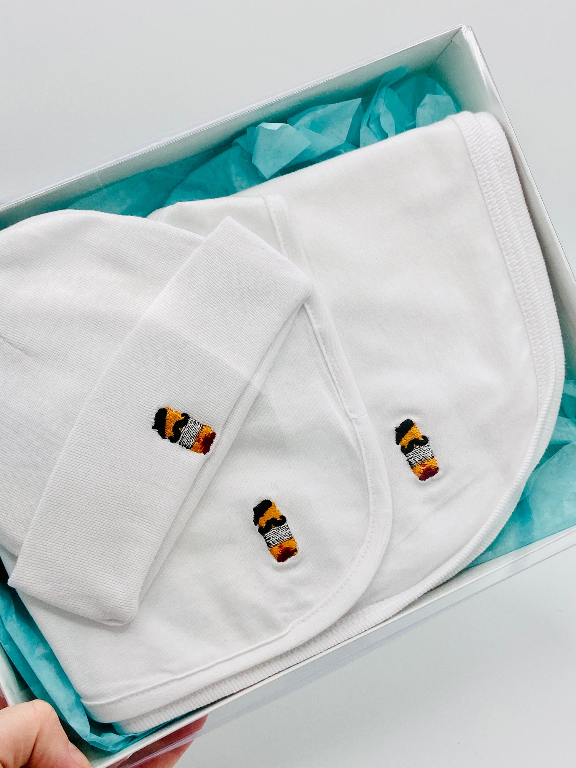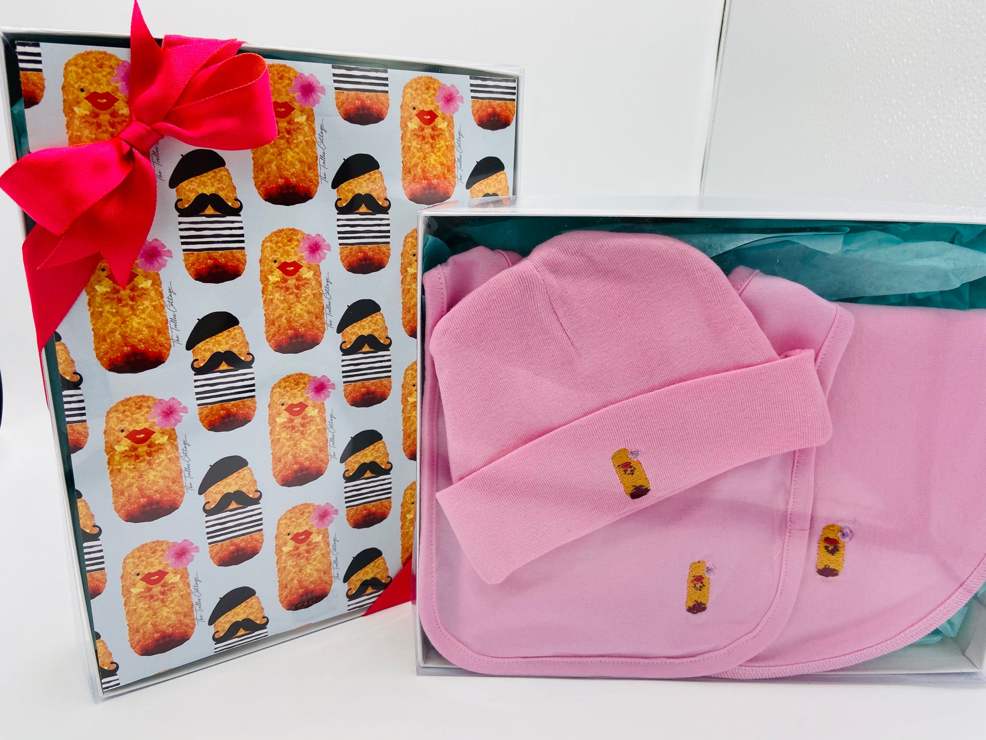 Our infant sets are complete with embroidered infant caps, bibs and a blanket. Choose between an embroidered Pepe Croqueta or Clarita Croqueta or our little Azabache. We think the gift packaging is everything. Perfect for your little Croqueta or as a unique baby shower gift.