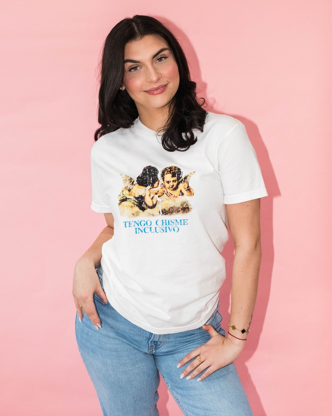 A playful homage to 90s nostalgia, when Jennifer Love Hewitt wore an angel tee on the set of Can't Hardly Wait. This tee features two cherub angels gossiping and reads, "Tengo Chisme Inclusivo" inspired by our two brands. Designed on a high-quality Comfort Colors t-shirt, it offers a relaxed unisex fit, perfect for anyone ready to mix inclusivity with a bit of cheeky gossip.