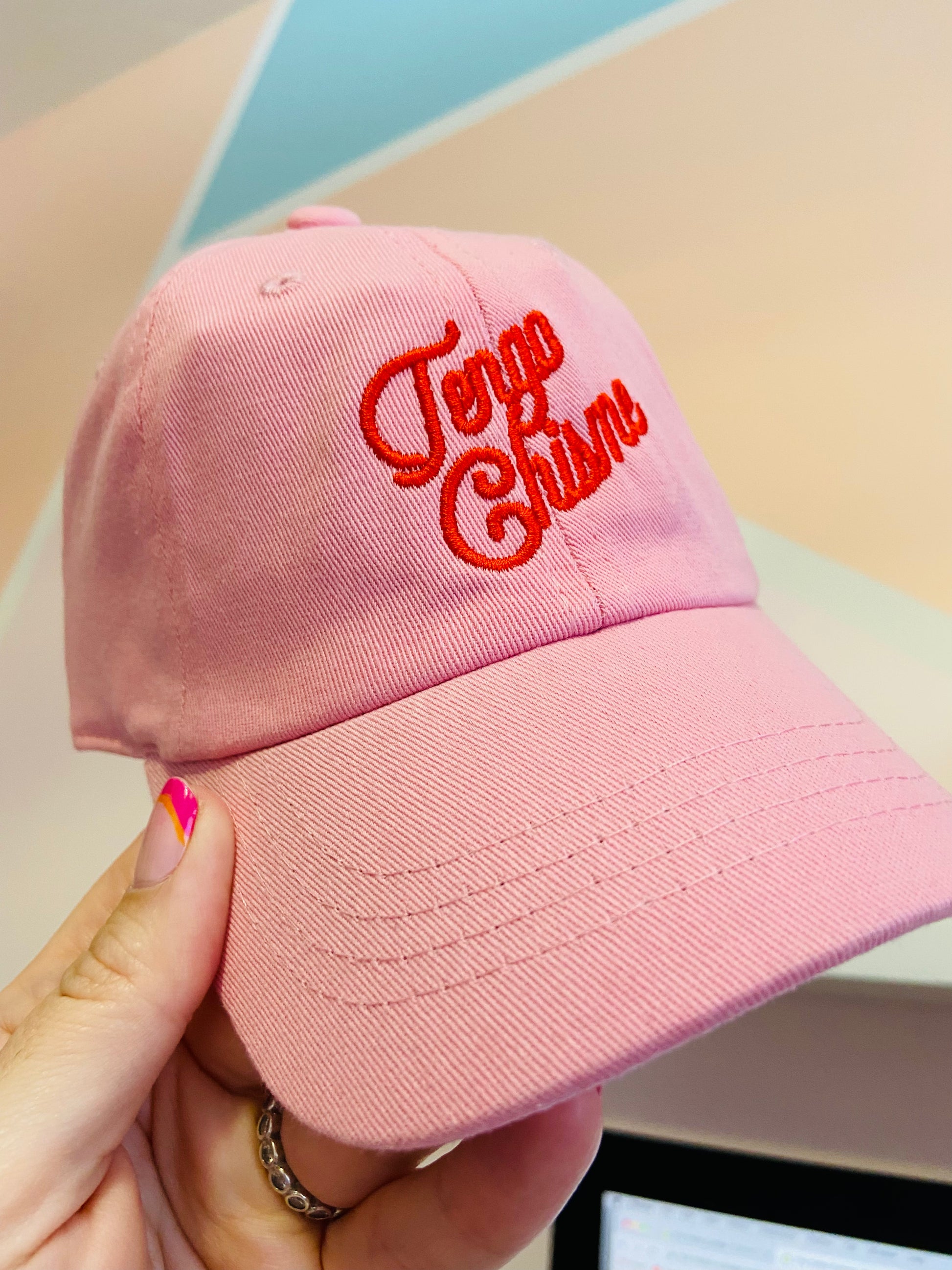 Our BEST SELLING hat, a Trelles Cottage original - Tengo Chisme TM, literal translation "I have gossip". But now for kids!!This one's got a low profile with an adjustable strap and curved visor. Please be patient and allow 8-10 business days for processing before shipping.